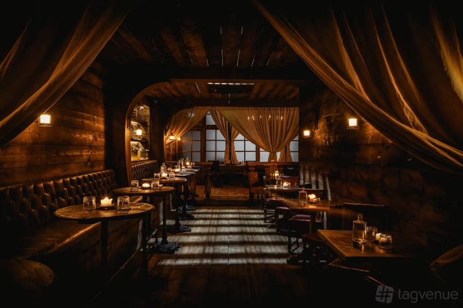 A spacious, bespoke cocktail bar with ship-hull design, high ceilings, and a warm candlelight ambiance.